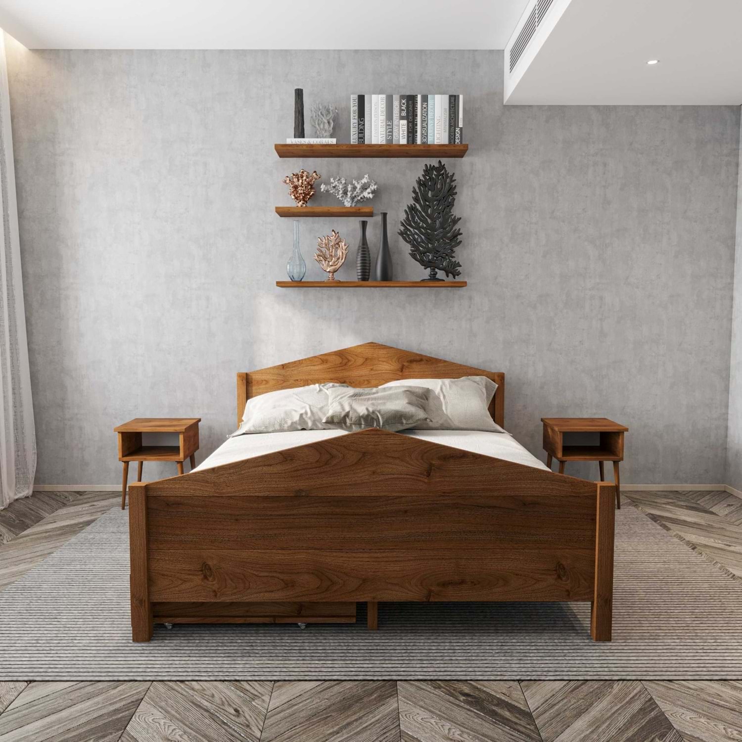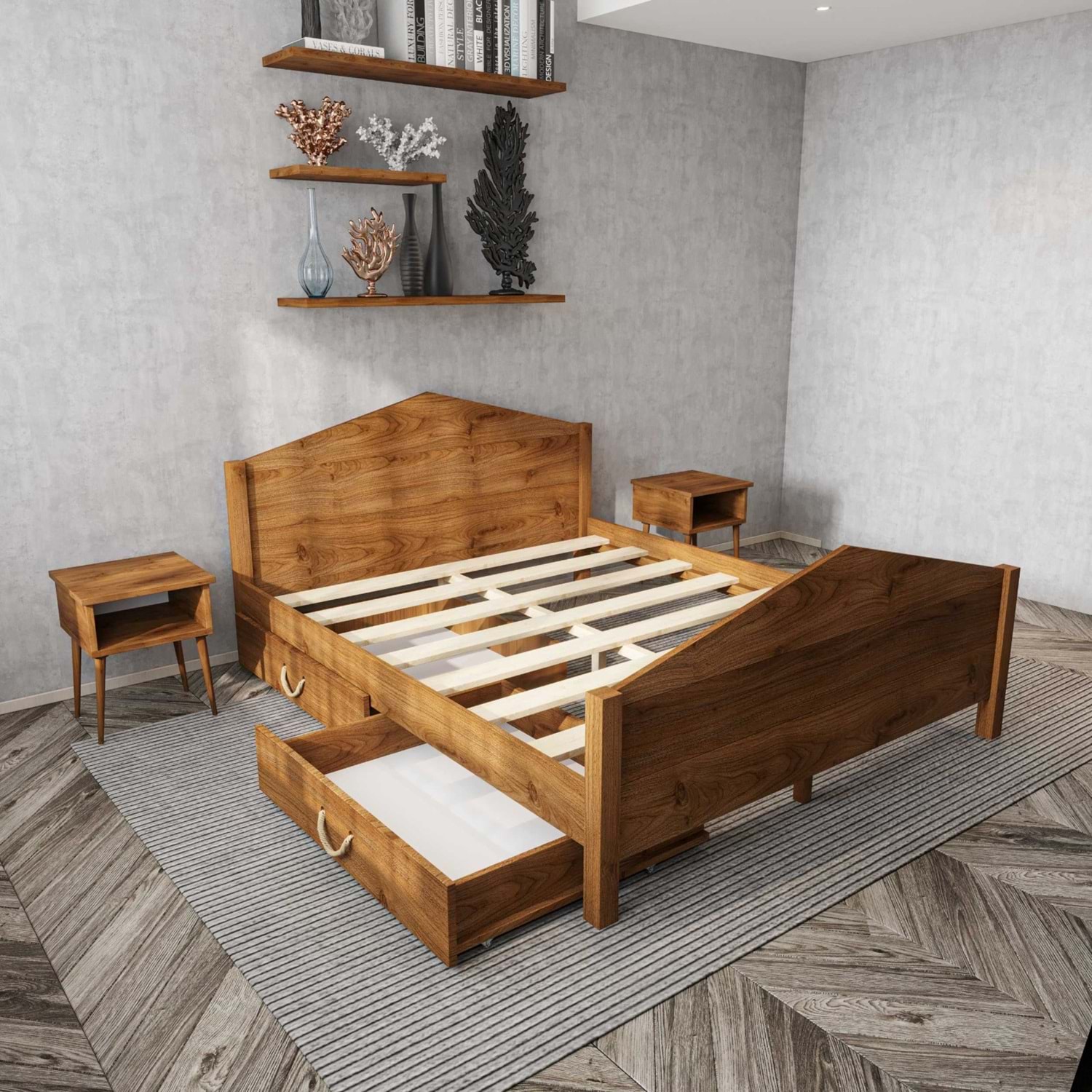 Milano Model İki Çekmeceli Ceviz Renk Çam Ahşap Karyola Ve İki Komodin Set