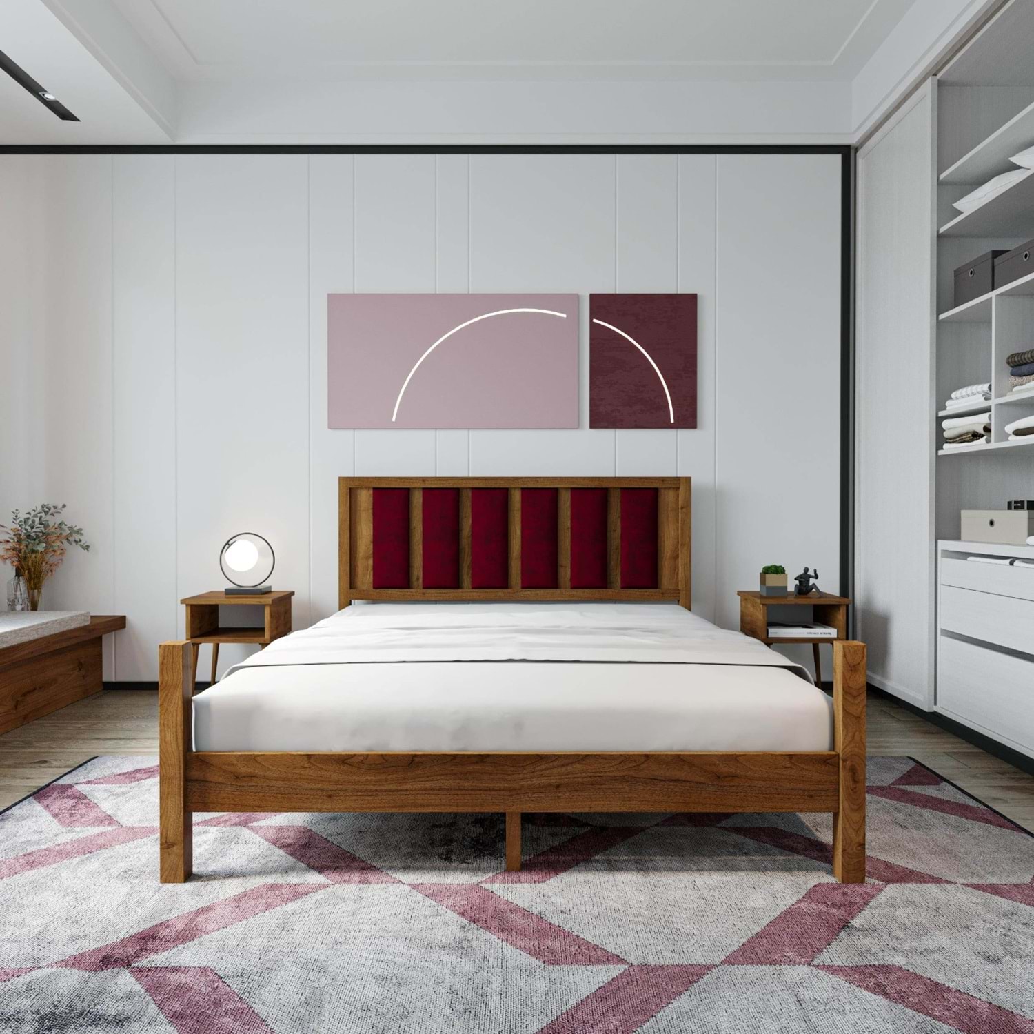 Orion Model Bordo Puflu Başlıklı Ceviz Renk Çam Ahşap Karyola