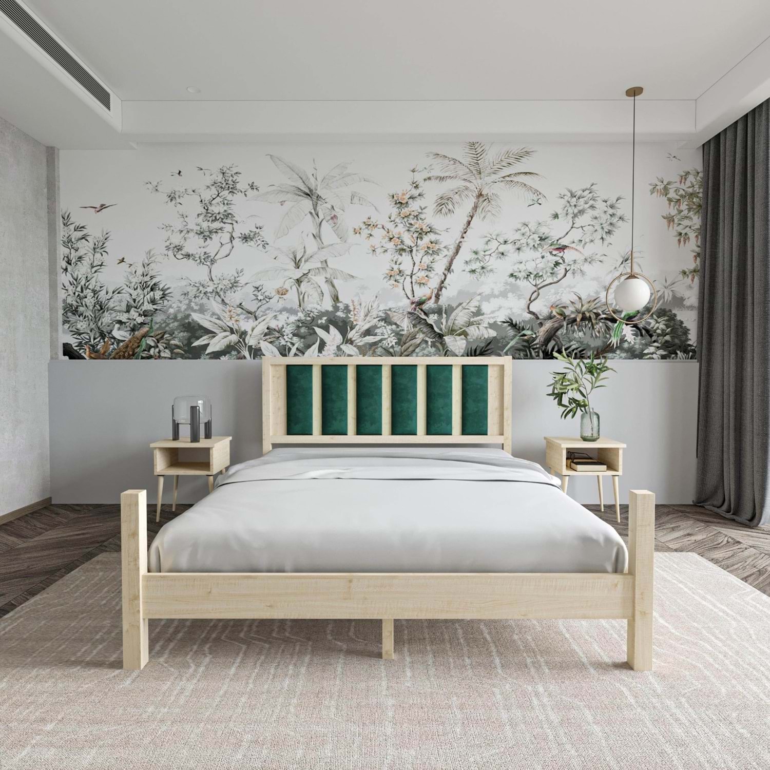 Orion Model Zümrüt Yeşili Puflu Başlıklı Doğal Çam Ahşap Karyola