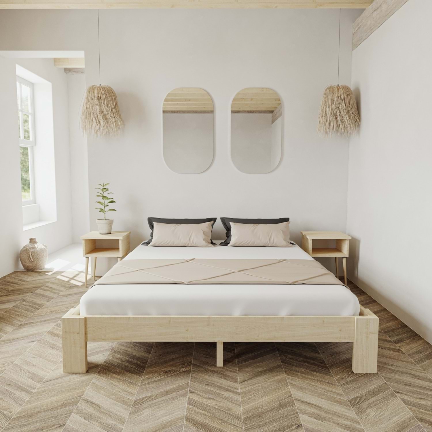 Yatak başlığı içermeyen tasarımı, odanızda daha ferah ve sade bir görünüm yaratır. Bu sayede karyola; duvar dekorasyonları, büyük pencereler ya da özel başlık tasarımları ile kolayca kombinlenebilir. Karyolanın yanındaki iki komodin ise sade ve kullanışlı bir alan sunar.