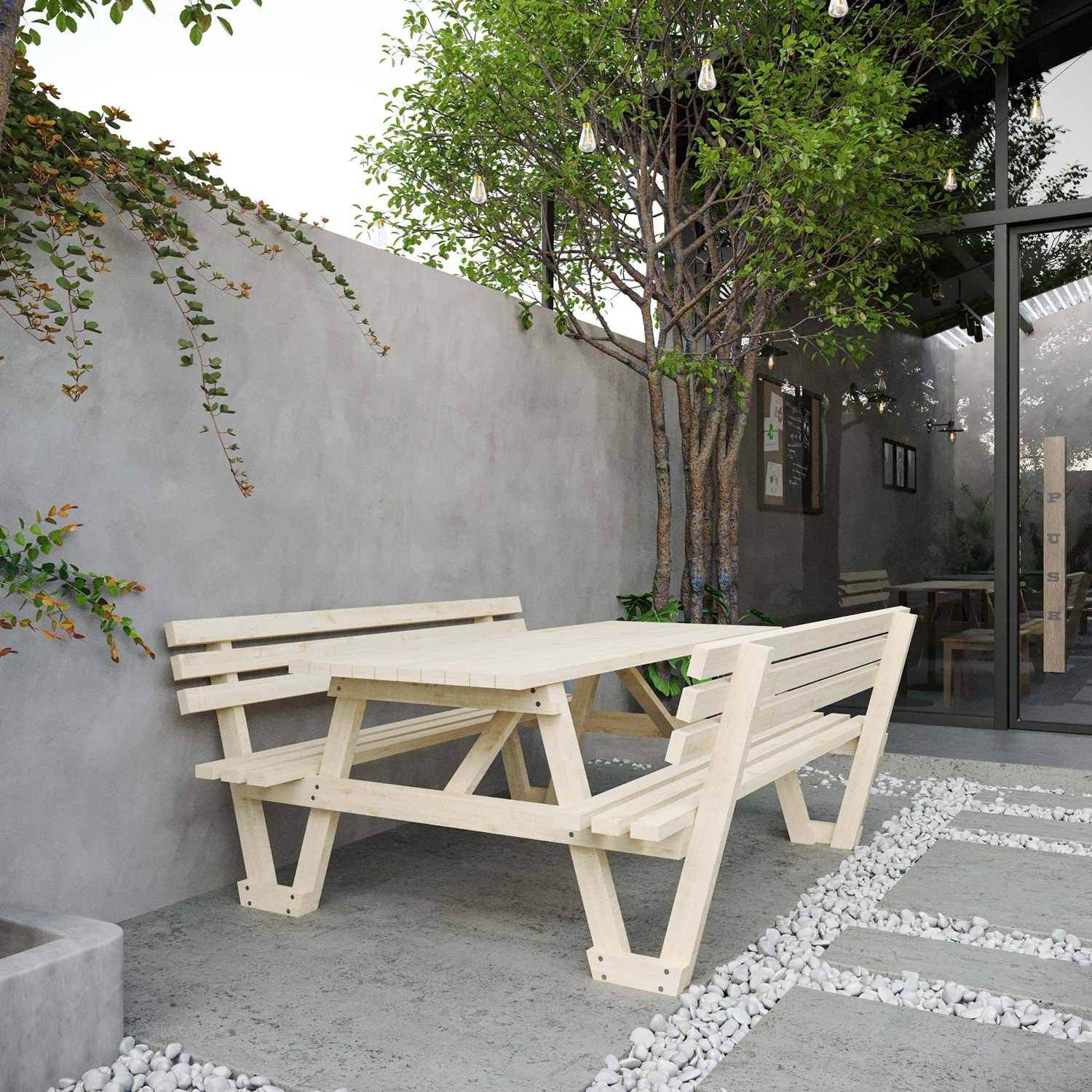 Masif ahşap piknik masamız ithal fırınlanmış çam ağacından üretilmektedir.