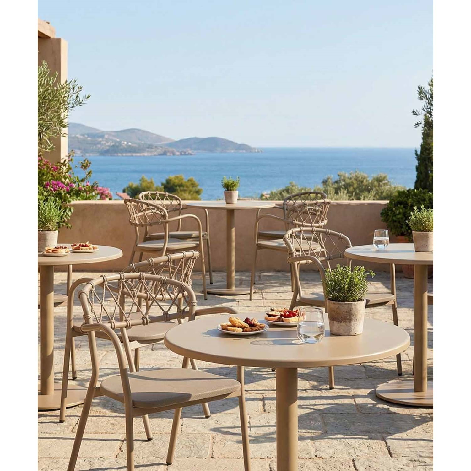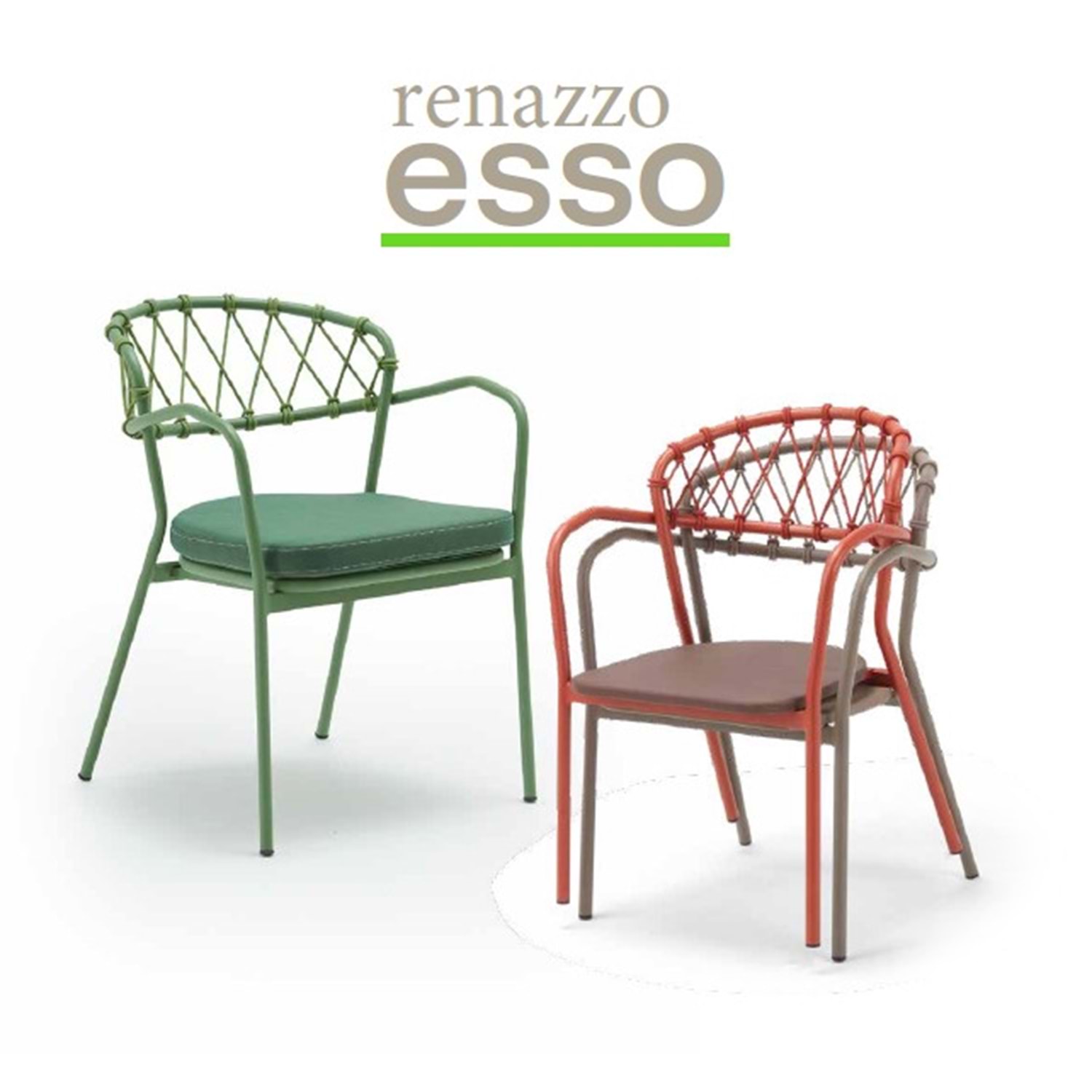 Dış mekanlarda klasik örgü dokusunu modern çizgilerle buluşturan Renazzo Esso Serisi, karakter sahibi mekanlar yaratmak için tasarlandı. Sırt kısmındaki özgün çapraz örgü detayı ve kavisli kolçak yapısıyla Esso, hem görsel bir şölen sunuyor hem de ergonomik bir oturma deneyimi vaat ediyor.