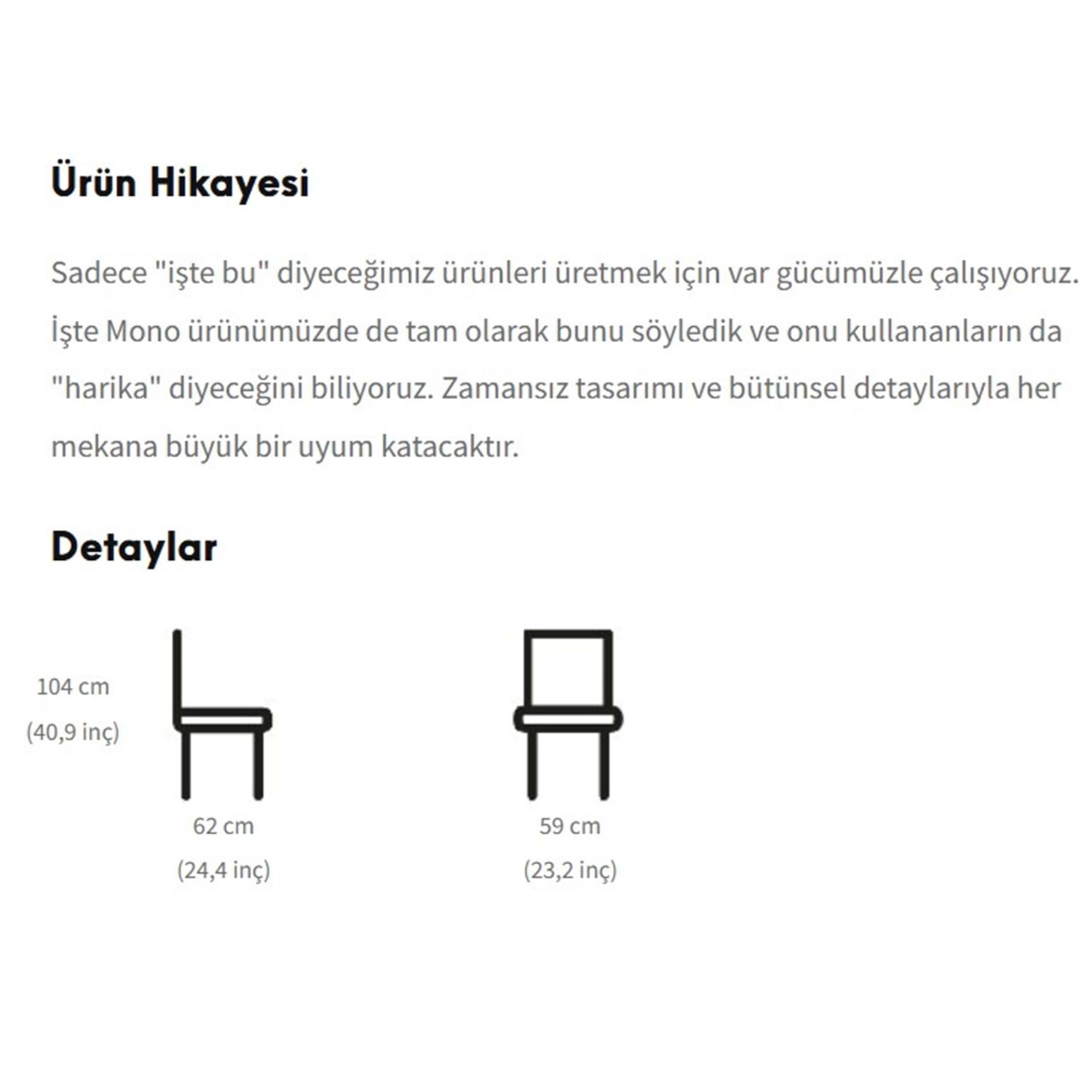 Konfor ve dayanıklılığı bir arada sunan Mono Berjer, uzun süreli kullanımlarda bile formunu koruyan sağlam yapısı ile öne çıkar. Ergonomik oturum yapısı, gün boyu rahatlık sağlarken kompakt ölçüleri sayesinde dar alanlarda bile verimli kullanım imkânı sunar.