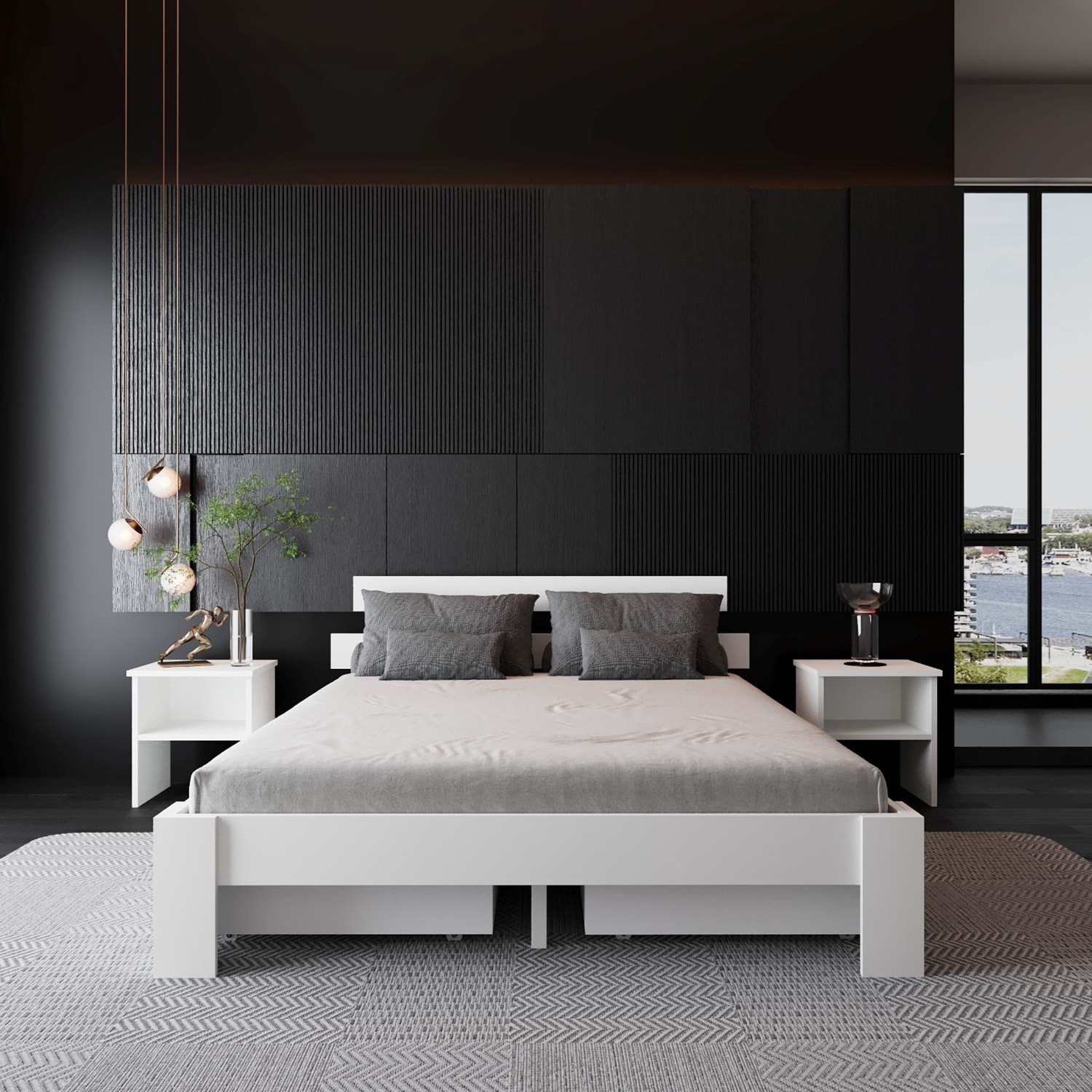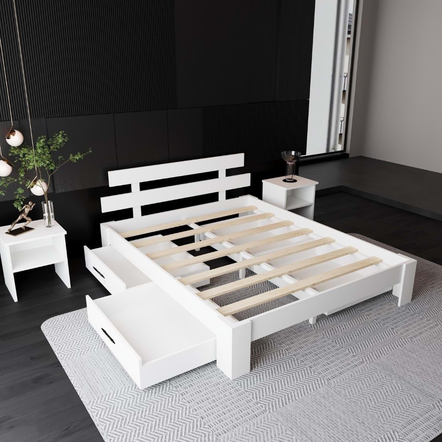 4 Geniş Çekmece: Karyolanın her iki yanında bulunan geniş çekmeceler; nevresim, giysi ve günlük eşyalarınızın depolaması için elverişlidir.