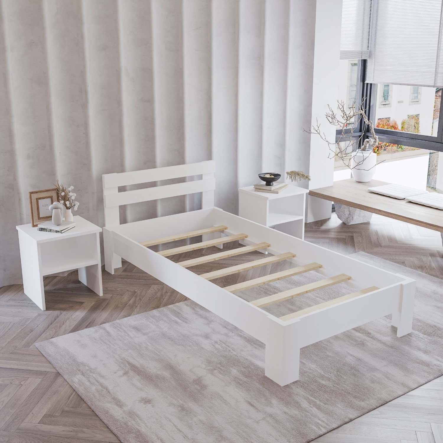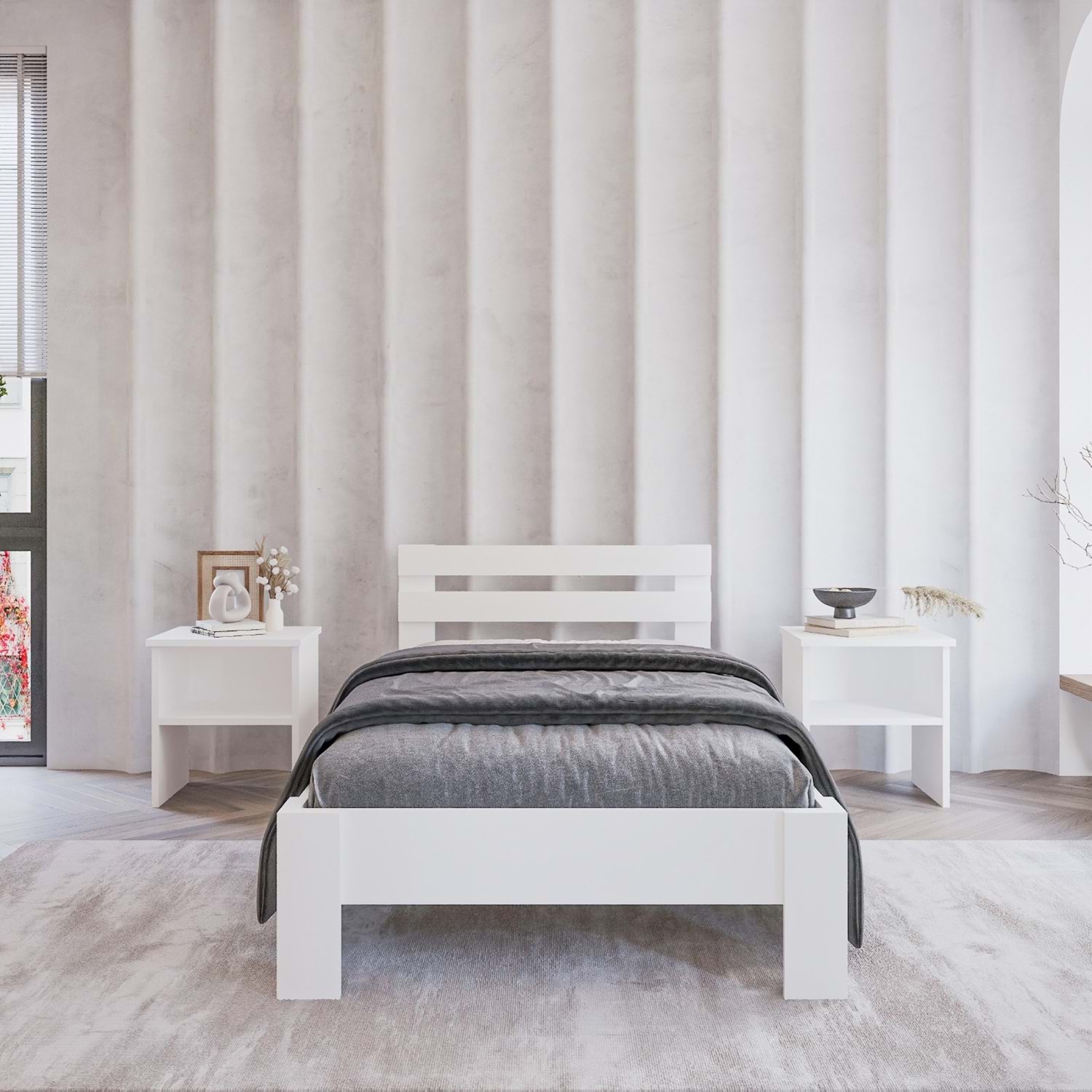 Hem sade hem de kullanışlı oluşuyla uzun yıllar rahatça ve sağlam bir şekilde kullanabileceğiniz, bütçe dostu ve estetik bir tercihtir. Ayrıca iki yanında bulunan iki raflı komodinler ile günlük eşyalarınızın yer sorununa çözüm getirebilirsiniz.