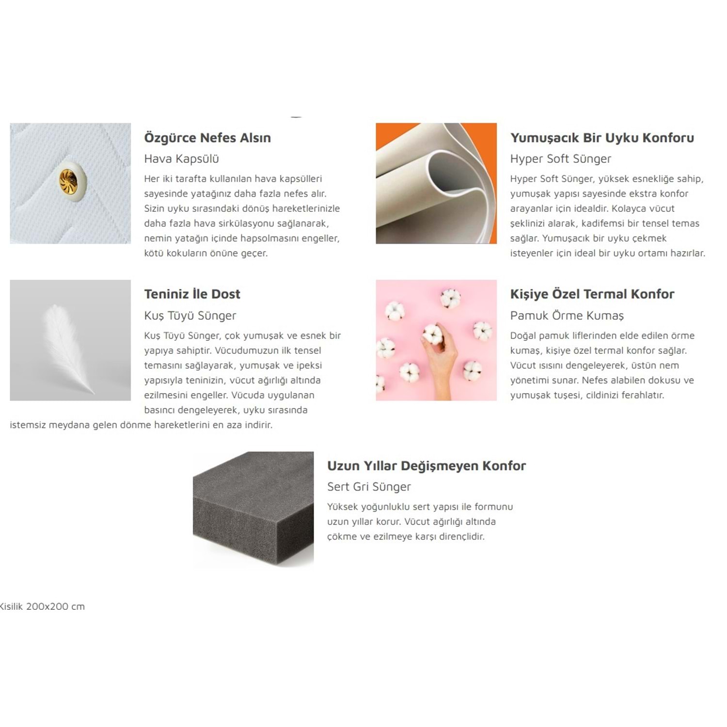 Her iki tarafta kullanılan hava kapsülleri sayesinde yatağınız daha fazla nefes alır. Sizin uyku sırasındaki dönüş hareketlerinizle daha fazla hava sirkülasyonu sağlanarak, nemin yatağın içinde hapsolmasını engeller, kötü kokuların önüne geçer.